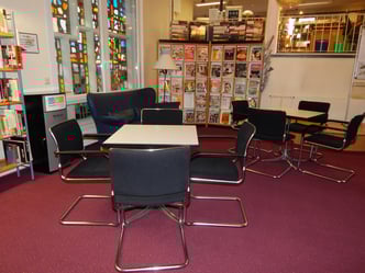 Dazu bieten wir Laptops mit Internetzugang, einen separaten OPAC (öffentlich zugänglichen Bibliothekskatalog) und eine gemütliche Atmosphäre, die zum Verweilen einlädt.