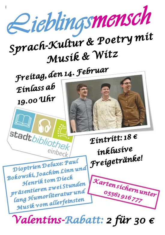 Karten für beide Veranstaltungen gibt es ab sofort in der Einbecker Stadtbibliothek telefonisch zu reservieren unter Tel.: 05561 - 916