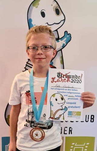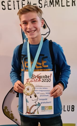Jeder der Klassensieger erhielt eine Medaille zur Auszeichnung. Der Gesamtsieger Malte Dahlmann, offizieller Ober-Leser 2020, zusätzlich noch einen Buchgutschein. Alle Seiten-Sammler die erfolgreich teilgenommen haben erhielten zudem eine Urkunde mit Namen und gesammelten Seiten, einen Rucksack aus Kraftpapier mit Kompass und Leopold-Button für alle Outdoor-Leseabenteuer, und ihren eigenen kleinen (Gummi-)Lurch, alles ermöglicht durch die Unterstützung des Fördervereins der Stadtbibliothek e.V. An dieser Stelle möchten wir uns auch herzlich für die Schirmherrschaft durch Bürgermeisterin Sabine Michalek bedanken, die den diesjährigen Lurchen nochmal extra-Schwung beim Lesen verliehen hat!